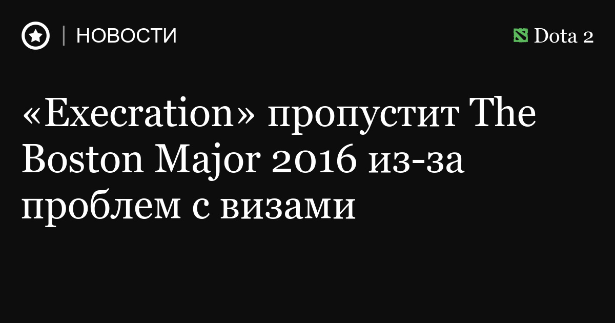Команда Execration (Филиппины) сообщила, что весь коллектив снимается с участия The Boston Major 2016 из-за проблем с получением американской визы. По словам менеджера команды Бехо Арвин Рисос, сразу три игрока не смогли вовремя получить американскую визу.